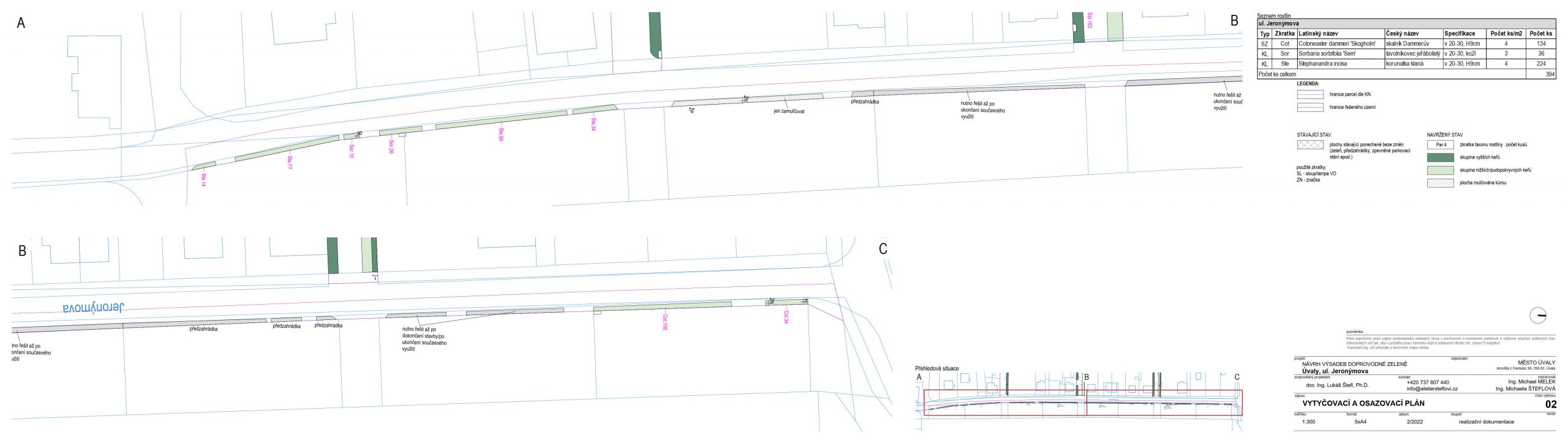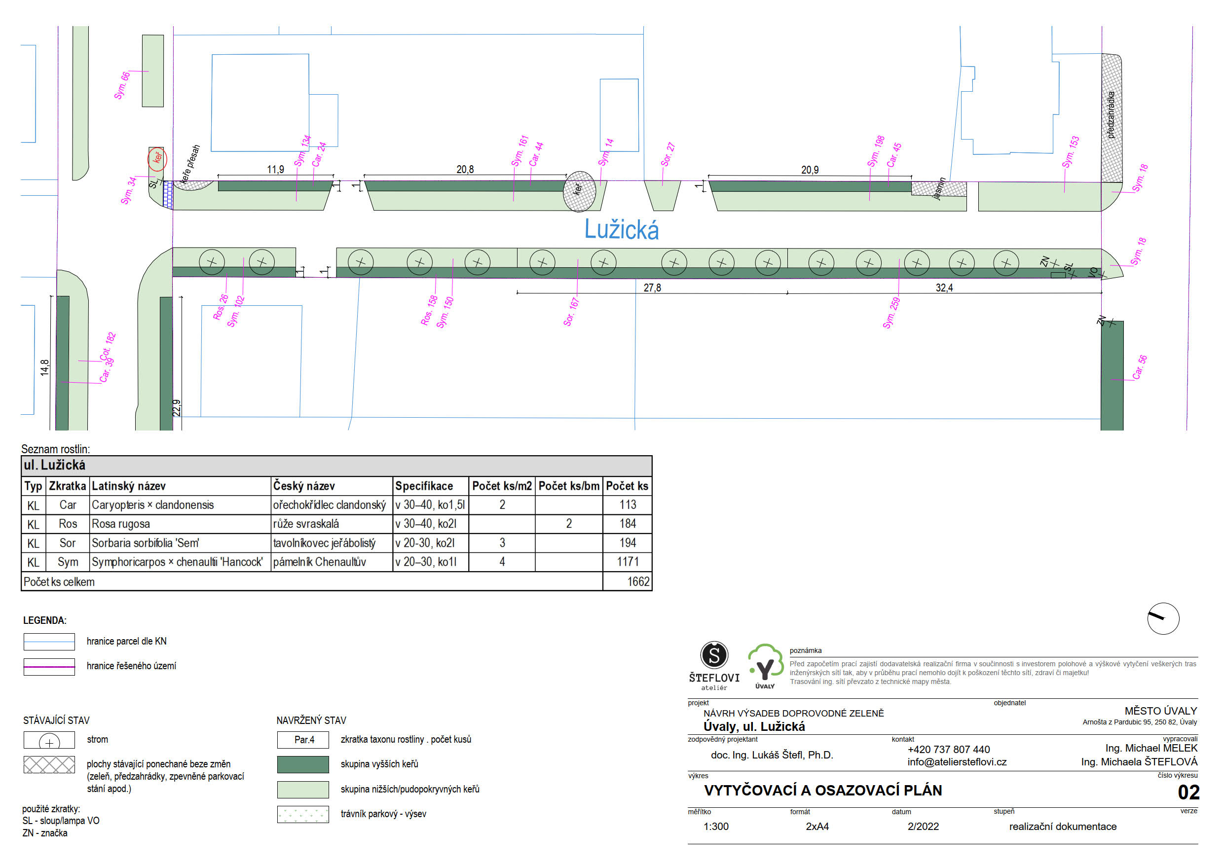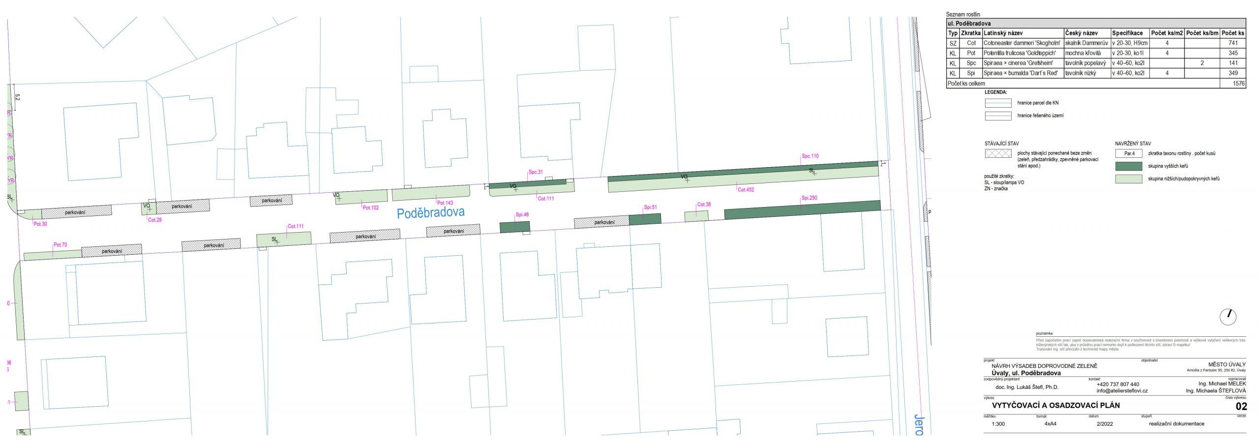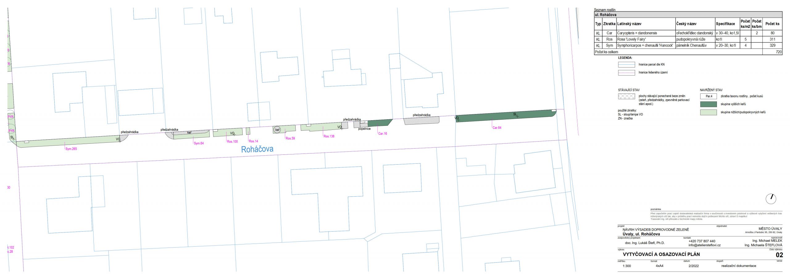 Zahradní architekt pan Doc. Ing. Lukáš Štefl, Ph.D. pro nás letos připravil, na základě požadavků města, balíček projektových dokumentací k ozelenění částí Úval – Radlická čtvrť a Slovany. Jedná se o rozsáhlou ozeleňovací akci, v celkové hodnotě 4,5 mil. Kč bez DPH. Vzhledem k tomu, že se jedná o rozměrově velké plochy, které nelze ekonomicky zrealizovat během jednoho roku, rozhodlo vedení města pro letošní rok o zkrášlení ulic Poděbradova, Jeronýmova, Táboritská, Roháčova a částečně ulice Chelčického. Sázet se bude v duchu nízkonákladové a máloúdržbové zeleně, s převahou půdopokryvných nebo nízkovzrůstných keřů, které jsou krásné nejen květy, ale i olistěním. Z biologicky málo zajímavého, ekonomicky náročného, často sečeného trávníku se nám tak stanou aktivní a živé plochy, které budou domovem pro malé živáčky a lahodící podívanou pro vaše oko. Výsadby se ujala společnost Bonsoft s.r.o., která s městem Úvaly uzavřela rámcovou smlouvu o dílo. Než však mohlo dojít k samotným zahajovacím pracím, pronásledoval nás opět neustálý nedostatek sadebního materiálu a hlavně prudký nárůst cen a jejich krátkodobá garance.