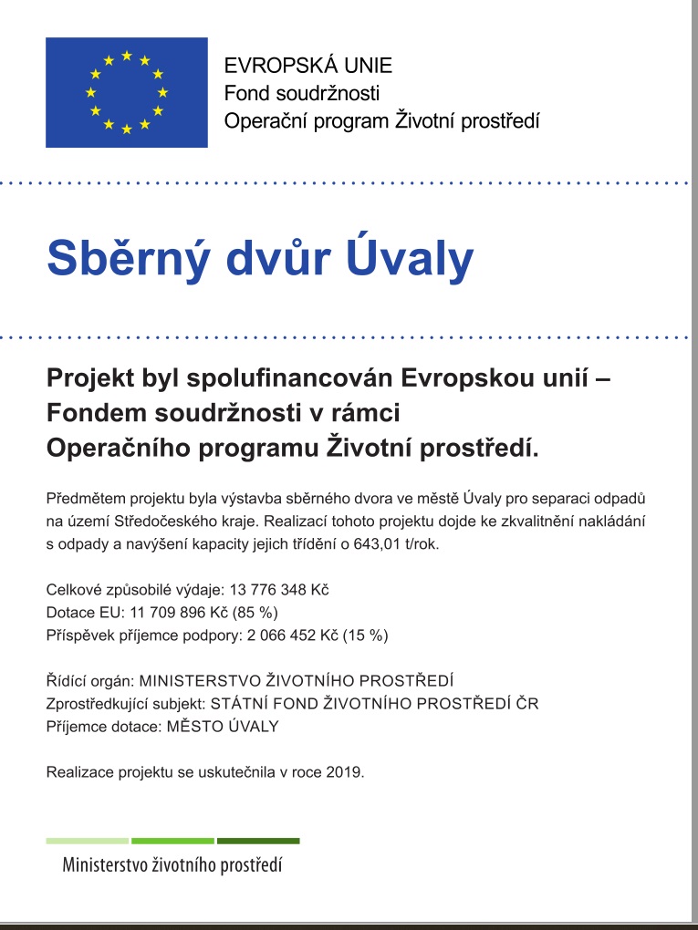 Dne 30.4.2020 jsme oficiálně ukončili a zkolaudovali stavbu “Sběrný dvůr”, který se nachází na pozemku parcelní číslo 3957/32, katastrální území Úvaly u Prahy (za bývalými stavebninami Krutský, dnes IZOMAT). Tento projekt byl spolufinancován Evropskou unii – Fondem soudržnosti v rámci Operačního programu Životního prostředí.
