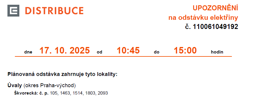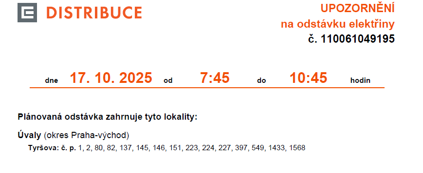 Odstávka elektřiny 17.10.2025 (Tyršova, Škvorecká)