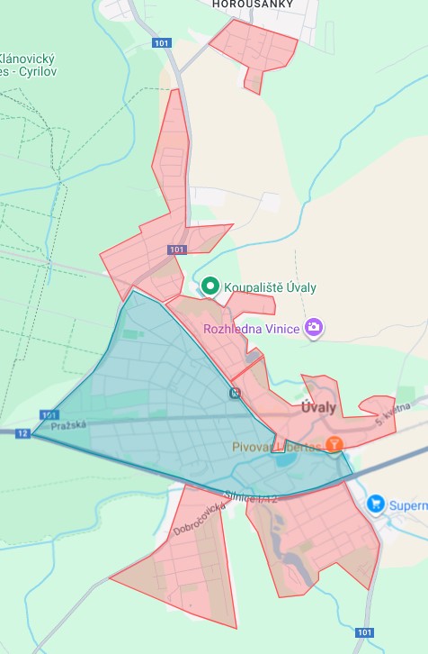 Pro lepší orientaci přikládáme ještě mapku – centrální část Úval je vyznačena modře.