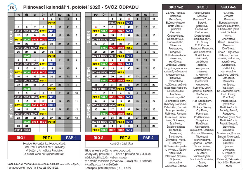 Od ledna se v Úvalech budou odpady svážet podle nového systému. V kalendáři najdete termíny svozu směsného (SKO) i bioodpadu (BIO), a také přehled, kdy budeme přímo od vašich dveří svážet papír (PAP), plast + tetrapak (PET) a použité oleje.