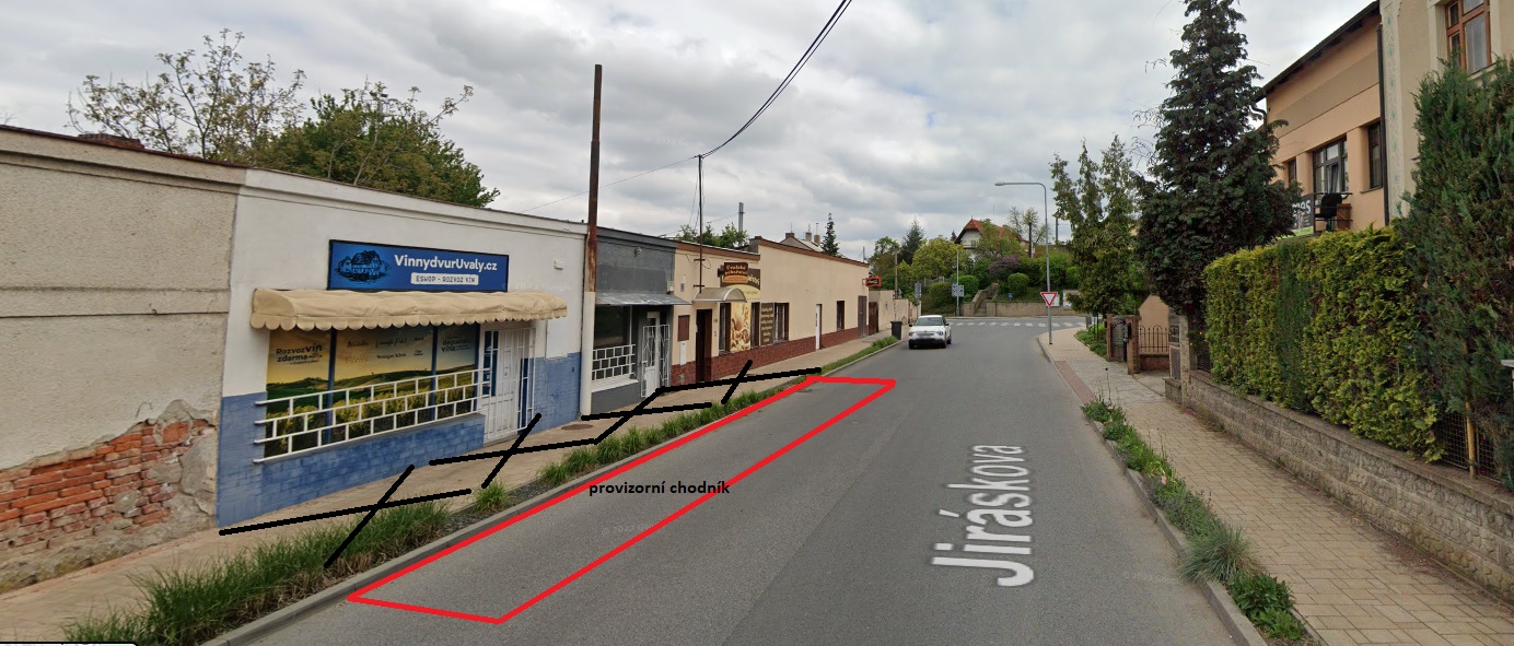 dovolujeme si Vás informovat o uzavírce části chodníku v Jiráskově ulici, Úvaly od 11.11.2024. Provizorní chodník bude zajištěn přes komunikaci Jiráskova. Vstup do prodejny pečiva a kosmetického salónu bude také zajištěn.