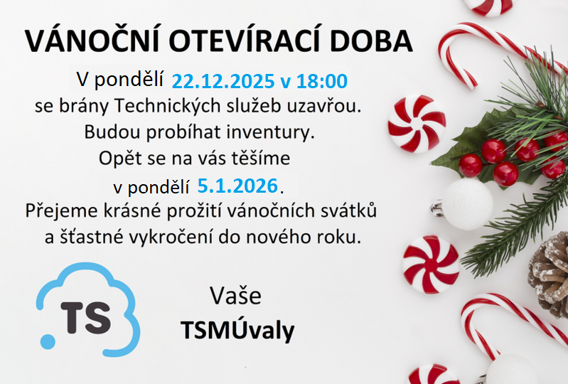 V pondělí 22.12.2025 v 18:00 se brány Technických služeb pro veřejnost uzavřou.
