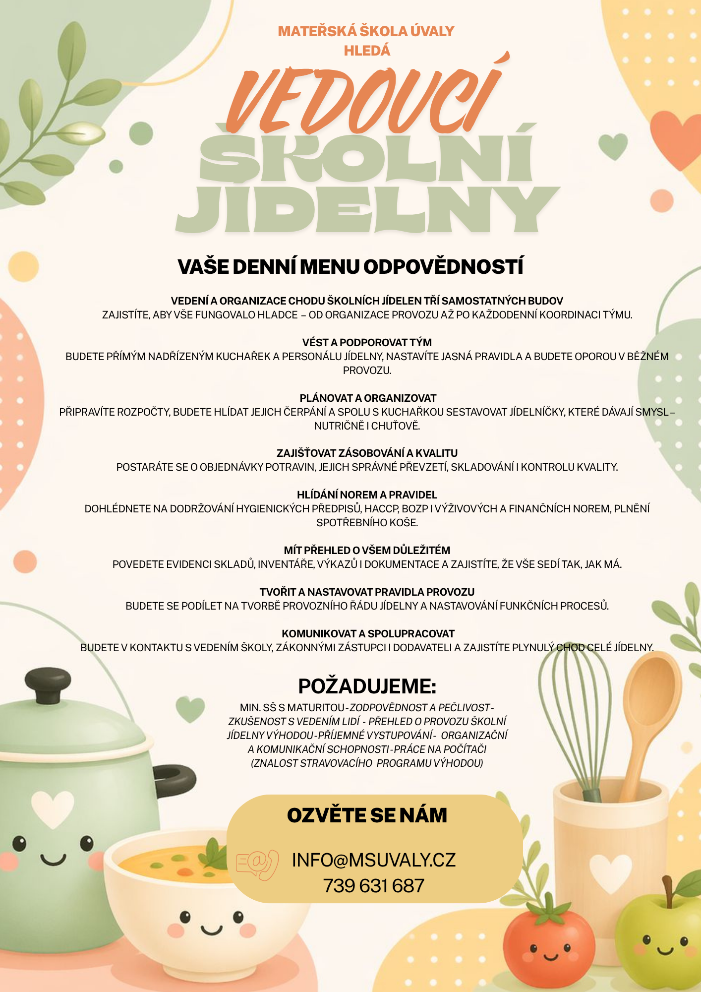 Volná pozice – MŠ Úvaly – vedoucí školní jidelny